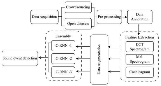 In the next step, the data labeling process was carried out, and three different types of spectrogram images, DCT, Cochleagram, and Mel, were obtained during the feature extraction phase. Augmentation techniques were then applied to these spectrogram images, in the final step of developing an acoustic model based on an ensemble of CRNNs. The process of the proposed methodology is shown in Figure 2.