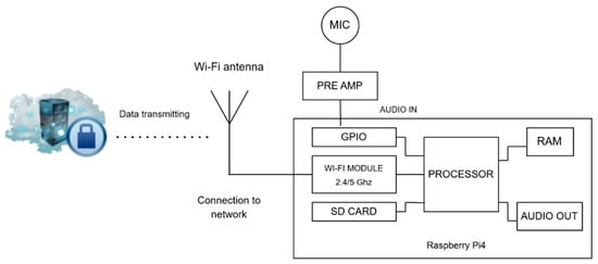 Recording sounds. A cloud-based approach was chosen to record and collect the sounds. The recording process included a Raspberry pi4 with a Wi-Fi module, mini-computer, and omnidirectional electret condenser microphone. The audio file was recorded in 16 kHz, 16 bit, and mono format. The “omnidirectional” microphone had a sensitivity of −44 dB and frequency characteristics of 20–20 KHz. You can connect it to a breadboard or perfboard or solder wires to the small wires hanging out of the rear. All recorded audio was saved in the Google Drive cloud. Figure 3 below shows the functional diagram of an IoT module for recording and storing event sounds.