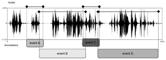 The problem of classifying sound events is multi-label classification, and therefore, there are rules for labeling data [44]. To customize the task of multi-label classification in short time segments, the audio annotation should also contain information about audio events in short time segments. There are special requirements for this type of annotation, which are called strong labels. That is, the annotation includes temporal information for each sound sample, including its start time and offset [45]. The strong-label process is performed as shown in Figure 4.