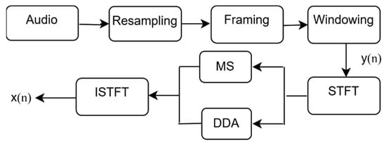 The recursive framework of the approach facilitates smoother estimation of both noise and signal components, thereby minimizing the introduction of artifacts. Finally, the time-domain signal x(n) is reconstructed by applying the inverse short-time Fourier Transform (ISTFT). An overall view of the noise reduction procedure is illustrated in Figure 5.