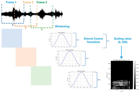 - DCT-based spectrogram: The incoming audio signal has a duration of 2 s (sampling rate, 16 kHz); after going through a framing procedure (frame size = 32 ms, overlap = 50%). the DCT spectral coefficients are calculated for each frame. The formula for the DCT of a 1D signal x[n] is given by