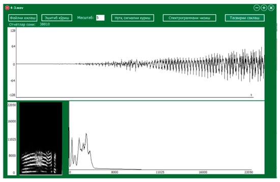 After obtaining the spectral coefficients for each frame, the spectrogram image was constructed in grayscale, where each value is scaled in the range from 0 to 255. The sequence of spectrogram image formation is shown in Figure 6. Figure 7 shows the time, frequency, and frequency–time (spectrogram) regions of the loaded signal used to generate spectrogram images.