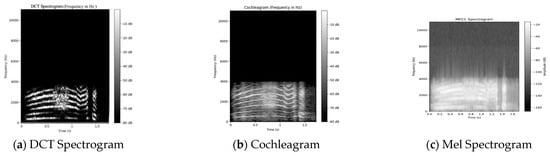 Figure 8 shows examples of grayscale images of a DCT spectrogram, Cochleagram, and Mel spectrogram.