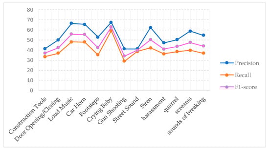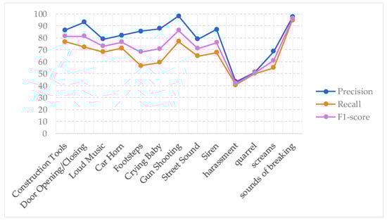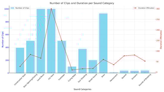 Currently, there are ready-made open source datasets such as UrbanSound8K [39], AudioSet Ontology [40], FSD50K [41], TUT Sound Events 2017 [42], and ESC-50 [43]. In our study, we used other relevant event sounds (different types of construction tool sounds, doors opening and closing, loud music sounds, car horns, footsteps, children crying, guns shooting, sirens) from this dataset.