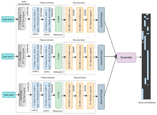 This research has developed a deep learning model for detecting sounds of emotional or disruptive events occurring around residential buildings. The audio data were converted into three types of images (DCT spectrograms, Cochelograms, and Mel spectrograms) to ensure that the developed model performs effectively under different noise conditions. We used CRNN models that extract reliable acoustic features from each frequency–time spectrogram in the time series and used them as a single ensemble model for SED. This model can detect sound events and perform temporal signal localization tasks. Important features of this model are that it can identify and distinguish each individual sound event from mixed acoustic sources that include strong background noise, as has been reported in real-world environments.