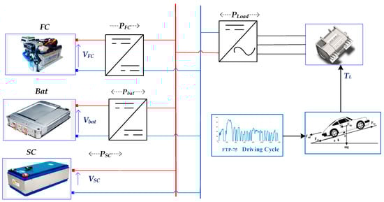 The power of the FCEV is derived from various sources, including a lithium-ion battery, energy storage systems utilizing supercapacitors, and, primarily, a proton exchange membrane fuel cell (PEMFC), as shown in Figure 1. A unidirectional DC/DC boost converter connects the fuel cell to the DC interface. A DC/DC boost converter that can handle both directions connects to the battery. The DC bus is directly linked to the SC. A bidirectional DC/AC converter delivers power to the vehicle’s motor during both traction and braking scenarios, enabling current to flow in either direction between the DC bus and the motor.