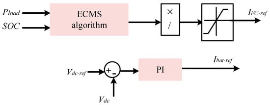An effective instantaneous cost-function-based system called the ECMS optimization method was created by [58]. The goal of the ECMS is to reduce fuel usage to a minimum by concurrently reducing the amount of FC hydrogen consumed and the total equivalent fuel from other sources to regulate the battery’s SOC within a certain range with a fine included objective function. Figure 2 illustrates the ECMS scheme.