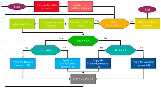 The AOA updates solutions using arithmetic operators such as addition, subtraction, multiplication, and division. The user employs the arithmetic operators to traverse the search space, and uses the addition and subtraction operators to exploit it [47]. As stated in Equation (8), the accelerated mathematical optimizer (MOA) is the control parameter that helps to maintain a balance between intensification and diversification in the search space [47].