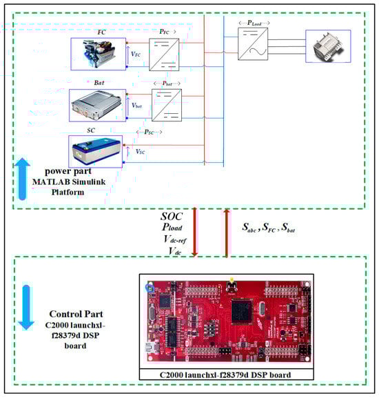 As illustrated in Figure 4, the PIL prototyping follows a structured approach where the power system’s power components are simulated within the MATLAB/Simulink environment using a predefined simulation time. Throughout each simulation step, the C2000 LaunchXL-F28379D DSP board receives control signals from the computer, executes the corresponding control algorithms, and transmits the generated control commands back to the computer. This iterative process forms a continuous PIL co-simulation cycle, ensuring real-time synchronization between the computer and the DSP board via serial communication. By leveraging this co-simulation framework, the accuracy, efficiency, and robustness of the proposed control strategy can be thoroughly assessed and refined before practical implementation.