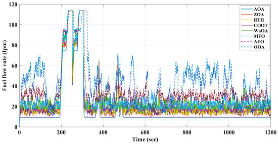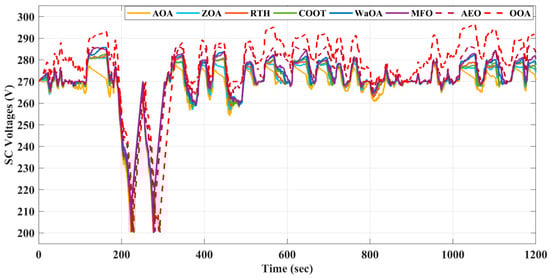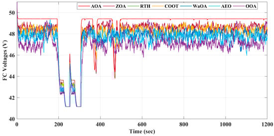 In Figure 9, you can see the obtained FC voltage data from different control techniques. The suggested approach used the FC with modest dynamics, which was different from the other techniques.