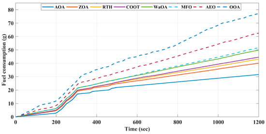 The actual implementation of this technology has the potential to enhance the experience of driving electric vehicles by enhancing their range through more efficient fuel usage and increased energy efficiency. The fuel consumption and system efficiency of the proposed EMSs are compared to those of the Zebra Optimization Algorithm (ZOA) [48], as well as the red-tailed hawk algorithm (RTH) [49], COOT-based optimization (COOT) [50], the Walrus Optimization Algorithm (WaOA) [51], the Moth Flame Optimization (MFO) [52], the Artificial Ecosystem-based Optimization (AEO) [53], and the Osprey Optimization Algorithm (OOA) [54].