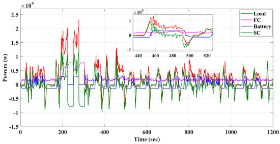 The load, fuel cell, SC, and battery power waveforms.