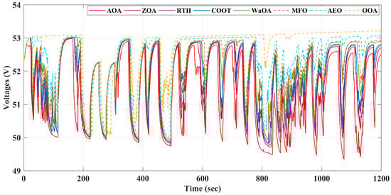 Figure 11 shows the battery voltage. The proposed method that was based on the AOA caused the battery voltage to show large fluctuations. The reason behind this was that the battery system was specifically engineered to protect the fuel cell system and significantly reduce voltage fluctuations. Consequently, as seen in the figure that follows, the amplitude of voltage variations increased.