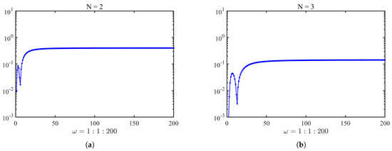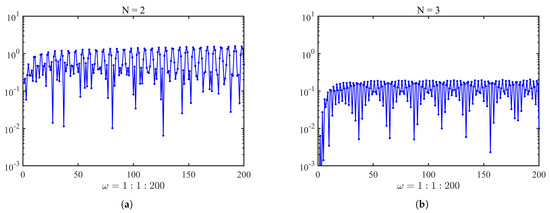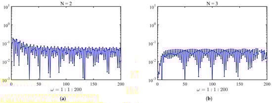 Similar to the previous example, the errors decrease rapidly as increases, and the method achieves high accuracy even for small N. As shown in Table 3, Table 4 and Table 5, these results further validate the robustness of our method for both finite and infinite integration domains, particularly for different values of .