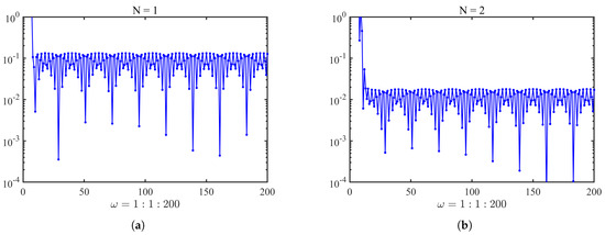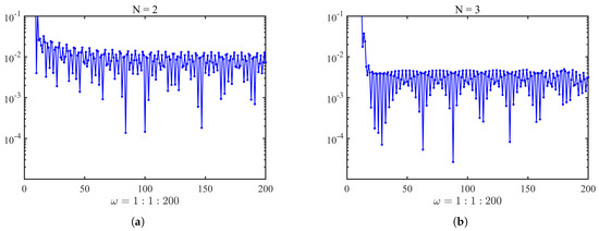 From the results in Table 2, the errors decrease rapidly as increases, and the method achieves machine precision even for small values of N. This demonstrates the effectiveness of our method for and .