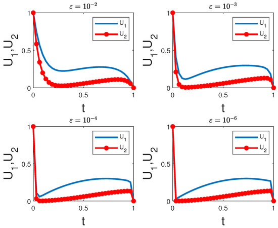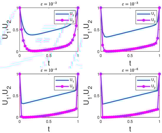 where , and . It is assumed that , where represents a positive constant. According to the assumption, the reaction–diffusion problem (1) contains boundary layers around and .