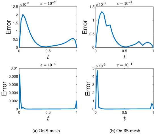 Error plots for with using the S-mesh and BS-mesh of Example 1.
