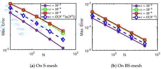 Log-log plots of and S-mesh and BS-mesh for Example 1.