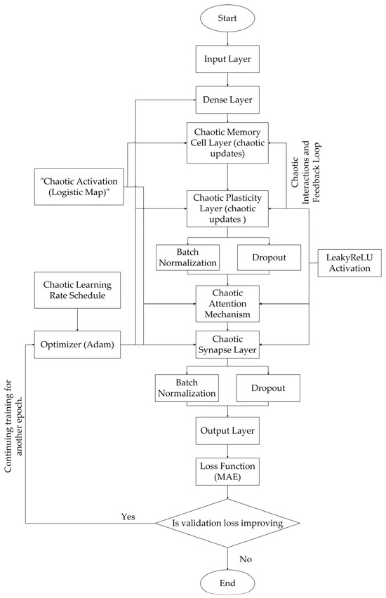 This section outlines the methodology behind the CISMN. The code integrates chaotic dynamics into neural network components, including memory cells, plasticity, synapses, attention, and learning rate schedules. Each component introduces mathematical and dynamic concepts rooted in chaos theory to enhance the network’s learning capabilities. Below is a detailed explanation of each methodology part, including its mathematical foundation and contribution to the overall architecture. Also, the flowchart of the developed CISMN is shown in Figure 1. It illustrates the architecture, including input preprocessing, chaotic layers (Memory, Plasticity, Synapse, Attention), and the Chaotic Learning Rate Schedule linked to the Adam Optimizer. A decision block checks if training should continue based on the Loss Function (MAE), and the process ends when the criteria are met.