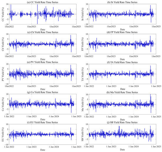 This study utilized the daily closing prices of selected indices from 4 January 2022, to 21 November 2024, as key data indicators. The indices include China’s carbon trading price (CC), the CSI All Share Steel Index (St), the CSI All Share Chemicals Index (Ch), the CSI All Share Paper & Forest Products Index (FP), the CSI All Share Passenger Vehicles & Auto Parts Index (PV), the CSI All Share Textiles & Apparel Index (TA), the CSI All Share Construction & Engineering Index (Co), the CSI All Share Machinery Index (Ma), the CSI All Share Electric Utilities Index (EU), and the CSI Shipbuilding Industry Stimulus Index (SB). Data were sourced from the CSMAR database and the China Securities Index. The CC index represents the closing prices of the national carbon market; the St and Ch indices represent the upstream steel and chemicals industries; the Co and Ma indices represent the midstream construction engineering and machinery manufacturing industries; the FP, PV, TA, and SB indices represent the downstream forest products, automobile manufacturing, textile, and shipbuilding industries. The EU index is included as a reference supplement for the power industry.