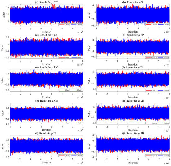 Figure 2 presents the dynamic tracking and iterative results of the volatility level parameters for China’s carbon market and traditional manufacturing industries. As shown in Figure 2, after the initial 10,000 burn-in iterations, the volatility of the iteration trajectories significantly decreases and gradually stabilizes into a steady-state distribution. This indicates that as the iterations progress, the model parameters converge and fluctuate within a stable range, demonstrating the stability and reliability of the DGC-t-MSV model. After sufficient iterations, the posterior distribution effectively characterizes the dynamic correlations and volatility spillover effects between China’s carbon market and traditional manufacturing industries.