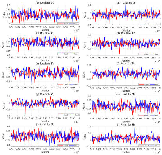 This study employed Gibbs sampling within the MCMC framework to conduct a convergence analysis of the selected data. Using MATLAB R2024b, the logarithmic returns of ten groups underwent 80,000 iterations, with the first 10,000 iterations discarded as a burn-in phase to mitigate early-stage instability. The remaining 70,000 iterations were retained for visualization analysis, and the final 200 iterations were magnified for detailed examination. Figure 2 and Figure 3 present the dynamic tracking iteration results for China’s carbon market and traditional manufacturing industries. By observing the stability of the iteration trajectories and the concentration of parameter distributions, the study assessed the convergence of the DGC-t-MSV model in capturing dynamic correlations and volatility spillover effects across markets.