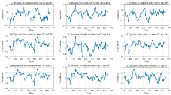 Secondly, the dynamic correlation between the CC and PV indices is also highly significant, with an average correlation coefficient of 0.0990, the highest among all dynamic correlation coefficients. However, despite the significant correlation, the dynamic correlation exhibits considerable volatility, with a range reaching up to 0.5541, indicating substantial fluctuations. The underlying reasons are twofold. First, the automobile manufacturing industry, especially during energy-intensive processes such as stamping and casting, produces significant carbon emissions, which makes its production costs highly sensitive to fluctuations in carbon prices. Second, the enforcement of carbon reduction policies is accelerating the transition of automotive manufacturers toward new energy vehicles, thereby intensifying the volatility in the dynamic correlation between the carbon emissions trading market and the automobile manufacturing industry.