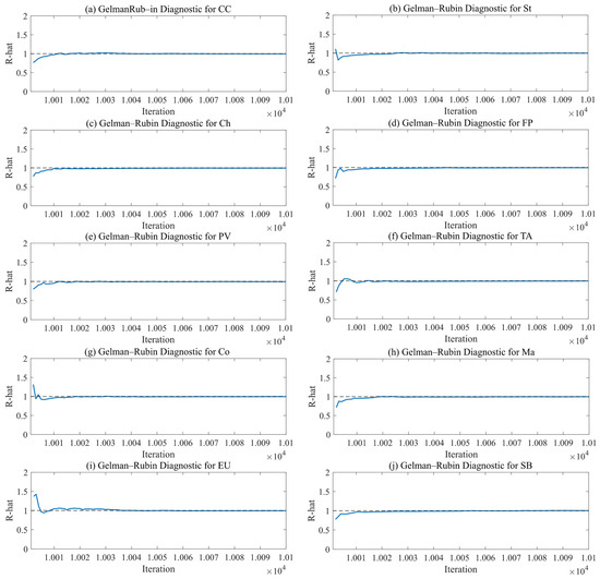 This study employed the Gelman–Rubin test to assess the convergence of the Markov Chain Monte Carlo (MCMC) method by comparing the variances of multiple chains to determine if the model has reached a stationary distribution. The procedures are as follows: First, two MCMC chains with different initial values are generated. Subsequently, the within-chain and between-chain variances are computed. Based on these variances, the potential scale reduction factor (PSRF) is calculated. A PSRF value approaching 1 indicates convergence of the Markov chain, whereas a value exceeding 1.1 or 1.2 suggests that the chain has not yet converged.