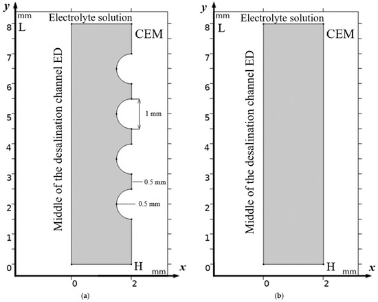 Scheme of half of desalination channel with geometrically modified surface of cation exchange membrane (a)—The considered area is half of the flow channel of desalination of ED with cation exchange membrane (CEM), where x is the coordinate normal to the membrane surface, changing from 0 (center of the channel) to H (boundary with CEM); y is the coordinate tangent to the membrane surface, changing from 0 (entrance to the channel) to L (exit) from the channel. Half of the channel is highlighted in gray, the membrane is on the right, solution is fed into the channel from below. Alternating convex geometric inhomogeneities in the form of semicircles are highlighted on the CEM surface. (b)—Half of the channel, as in the first, with the same volumetric flow rate and concentration, but without structural inhomogeneity of the membrane surface. On the structured membrane surface, the no-slip condition is specified, and on the smooth surface (Figure 1b), the velocity symmetry along the X axis is specified.