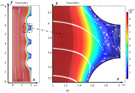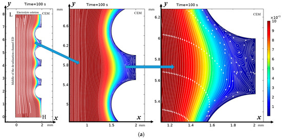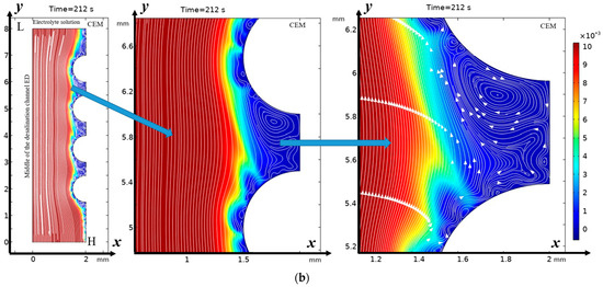 Solution streamlines and cation concentration distribution (highlighted in color; scale on the right) at (a) 100 s (0.5 V) and (b) 212 s (1.06 V): on the left—general view, in the center—first magnification of a fragment (two hills and a valley between them), and on the right—second magnification—streamlines and concentration distribution over the valley. Vortex zones are located in areas of low concentration (blue color). The arrows indicate the direction of rotation of the vortices. The figure shows areas with swirling flows, where the arrows indicate the movement of the fluid clockwise or counterclockwise.
