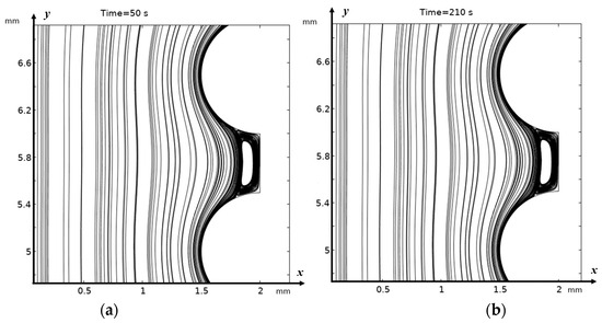 Solution streamlines at (a) 50 s (0.25 V); (b) 210 s for the absence of external electrical force, i.e., for purely hydrodynamic flow.
