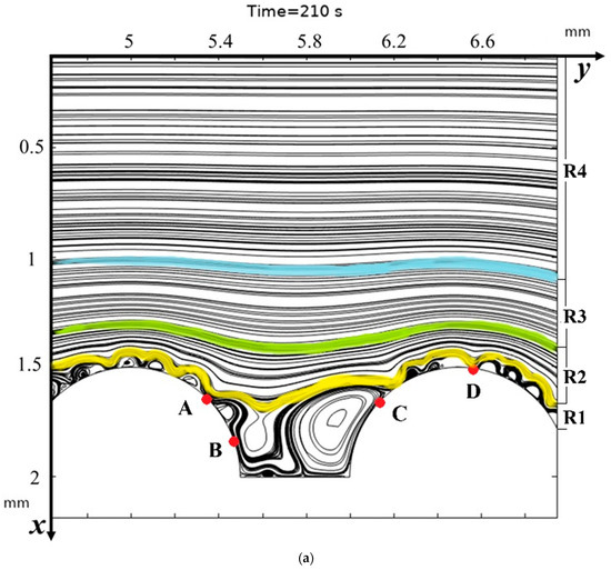 From Figure 4a, it is evident that the general structure of the flow, if moving across the channel, starting from the middle to the membrane, contains several regions: the flow core (in Figure 4a this region is designated as R4), where the flow is practically not disturbed and is a Poiseuille flow. Region R1, in which the streamlines are the envelopes of the vortex zone and are directly adjacent to the vortex zone. The region of curved flow—R2, which is enclosed between the envelopes and the flow core, is where the flow differs from the Poiseuille flow and where the solution streamlines are gradually deformed from the envelope streamlines to the Poiseuille streamlines—R3.