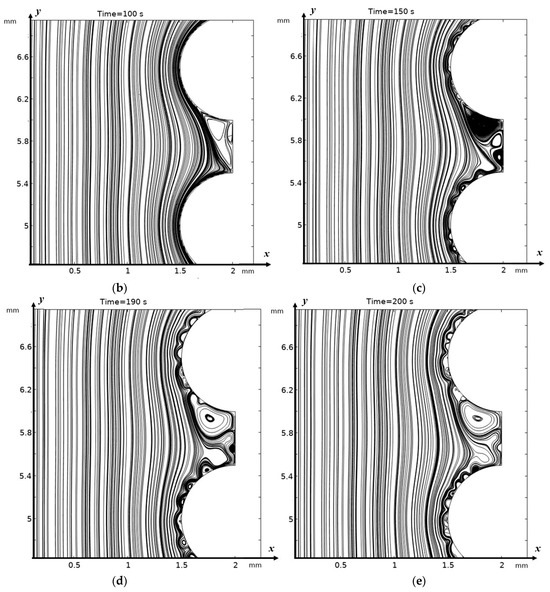 Solution streamlines at different times: (a)—flow structures at 210 s (1.05 V); change in flow structure over time (b)—100 s, (c)—150 s, (d)—190 s, and (e)—200 s.
