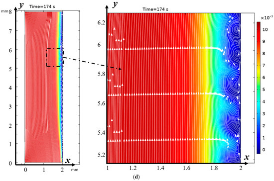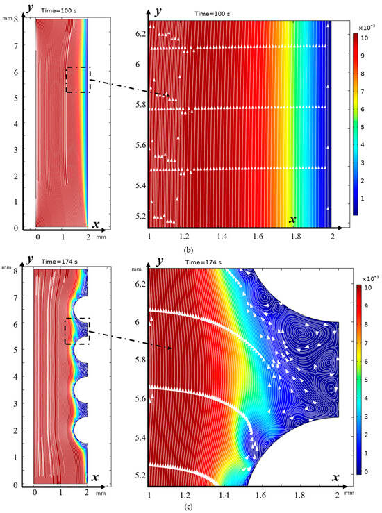 Distribution of concentrations (highlighted in color) and solution streamlines for models with a structured surface (a,c) and an unstructured smooth surface (b,d) at different times of (a,b) 100 s (0.5 V), and (b,d) 174 s (0.87 V). Vortex zones are located in areas of low concentration (blue color). The arrows indicate the direction of rotation of the vortices. The figure shows areas with swirling flows, where the arrows indicate the movement of the fluid clockwise or counterclockwise.