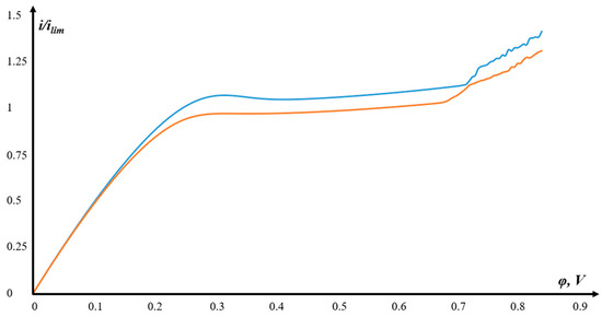 In Figure 6, the abscissa shows the values of the potential drop, and the ordinate shows the current density value, dimensionless by the limiting diffusion current according to Leveck [34,35]: .