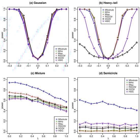 For the purpose of comparison, we select several commonly employed methods to test the independence of two multivariate vectors. These include distance covariance (DCOV) [] and its marginal rank-based version (RDCOV) ([]), the Hilbert–Schmidt Independence Criteria (HSIC) [], along with two additional methods that bear similarity to the construction of our proposed statistic (they are, respectively, based on Spearman’s and Kendall’s , as referenced in [,], denoted as Mrho and Mtau, respectively). All methods perform tests using permutation-based approaches with 1000 permutations, including our proposed method which specifically utilizes the permutation testing procedure described in Algorithm 1. Two sample sizes are set, and , with dimensions of . A significance level of 0.05 is set for all scenarios, with 1000 replicate simulations conducted. Detailed information on data generation can be found in the following four examples.