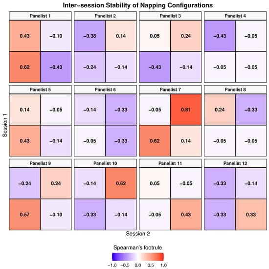 Heatmap of Spearman’s footrule correlation matrix across intersession comparisons for 12 panelists.