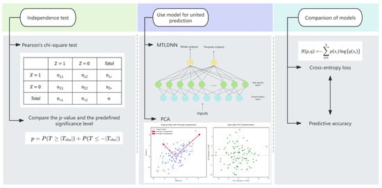 This paper is structured to guide the reader from foundational research to practical applications and final insights. Section 2 reviews the literature on travel pattern and purpose predictions, setting the stage for understanding the current challenges. Section 3 presents an analytical framework with an independence test for travel patterns and purposes, followed by an MTLDNN model. Section 4 applies this framework in a case study, discussing datasets, model performance, and behavioral insights. Section 5 concludes with a summary of the findings, this study’s significance, and future research directions, linking the contributions to broader research and policy contexts.