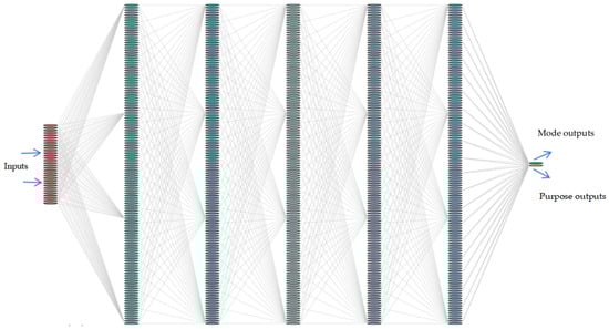 where denotes the depth of shared layers, while denotes the depth of the task-specific (non-shared) layers for each individual task. The transformation of a single shared layer is denoted as , whereas and correspond to the transformations of individual layers in the mode and purpose tasks, respectively. With the exception of the output layer, all transformation functions—including , , and —consist of a ReLU activation followed by a linear transformation, expressed as . The overall MTLDNN architecture is outlined in Equations (2) and (3) and visually represented in Figure 1, where signifies the shared layers, and and correspond to the task-specific layers for mode and purpose analyses, respectively. The probability distributions for mode and purpose choices are determined using a standard softmax activation function, which is widely applied in multi-class classification, as shown below.