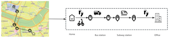 The data were collected from volunteers and record their location and time information for boarding and alighting from various transportation modes, as well as transfer points. An example of the travel process for one volunteer is illustrated in Figure 3, which includes four modes of transportation: walking, bicycling, bus, and subway.