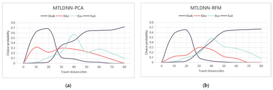 The alternative mode of MTLDNN is generally reasonable and intuitive. As shown in Figure 4a–c, when the travel distance is less than 10 miles, alternative options will replace each other. Walking is the preferred mode of transportation for most travelers, followed by cycling, while the probability of choosing other modes of transportation is relatively low. When the travel distance is around 20 miles, there will be more cyclists. When the travel distance reaches 30 miles, the number of travelers choosing to take the bus increases sharply, and as the travel distance gradually increases, the number of users choosing to take the subway also continues to increase, becoming the main mode of transportation. After clustering and feature extraction of the data, the alternative modes of MTLDNN-PCA and MTLDNN-RFM are more flexible than using the MTLDNN alone.