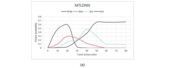 This intricate pattern may stem from the recognition challenges inherent in the DNN model (Wang et al., 2020 [53]). Due to the stochastic nature of deep learning, each training session can yield significantly different models, even when using the same dataset and fixed hyperparameters. Overall, this analysis suggests that the proposed MTLDNN is interpretable and capable of generating reasonable and intuitive alternative mode choices for travel behavior analysis.