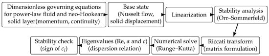 A flowchart summarizing the methodology for the linear stability analysis of a power-law liquid film flowing over a deformable inclined plane, covering system definition, formulation, linearization, Riccati transformation, numerical solution, and stability analysis.