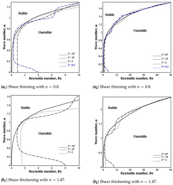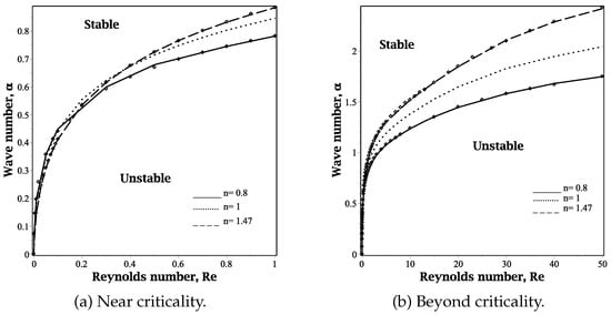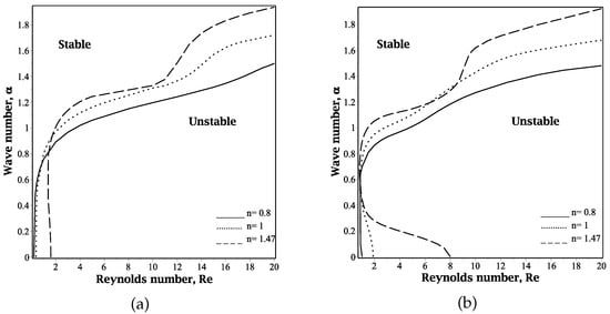 Figure 3a shows that increasing the power-law index n leads to a decrease in the marginal wave number. This implies that, in a low Reynolds number range, shear thickening enhances stability, while shear thinning promotes instability. This effect is clearly established by the fact that effective viscosity is reduced by decreasing n for shear-thinning fluids, whereas it is expected to increase with increasing n for shear-thickening fluids. The result obtained is in good agreement with the conclusions reported in various studies, especially for the case () with a rigid plane [] for power-law fluids. It is clear from Figure 3b that different behavior occurs at high Reynolds numbers, when the destabilizing effects of inertia outweigh the stabilizing influence of gravity. In this case, increasing n increases the range of unstable wave numbers. As we will see later, for moderate and large values of the Reynolds number (Re), the power-law property tries to reduce the most excited disturbance waves by reducing the maximum amplification of perturbation.