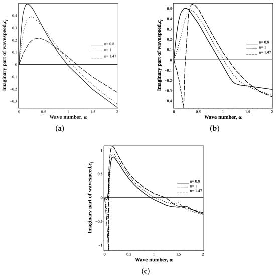 To further investigate both surface and interfacial modes, Figure 6 presents the variation of the complex wave celerity, , as a function of for different values of : (a) , (b) and (c) . When the solid layer is non-deformable (), the flow remains unstable () for long-wavelength perturbations, with the dominant mode being a surface mode, as described in []. Notably, the complex wave celerity increases as the power-law index n decreases (see Figure 6a for Re = 3). Additionally, the range of unstable wave numbers shrinks as n decreases.