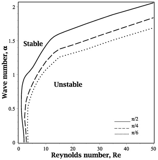 The variation in the shape of the instability curves in the (Re, ) plane for varying inclination angles is shown for , and different values of the angle: , , and . The parameter values for W, , , and remain the same as in Figure 3.