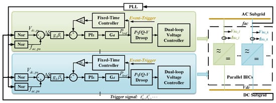 Currently, HMGs are becoming more and more popular because they integrate the dominance of AC and DC subgrids. The system can handle both AC and DC loads at the same time, reducing the number of power transitions between AC and DC, significantly reducing the power loss of the system. Meanwhile, BICs are the key to coupling AC and DC microgrids and achieving higher efficiency in the system []. Note that the increased number of distributed generators (DGs) connected to the subgrids will lead to the increase in capacity of each subgrid. This will result in more power flow between subgrids. To meet the requirements of the growing grid capacity, multiparallel BICs can be applied []. Although plenty of research has paid attention to the power sharing of BICs, the traditional elastic control strategy realizes power sharing with a consensus in infinite time with slow convergence [] and frequent controller triggers. To fill this gap, this paper proposes a fixed-time event-triggered power-sharing control strategy for HMG parallel BICs.