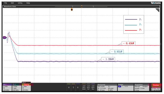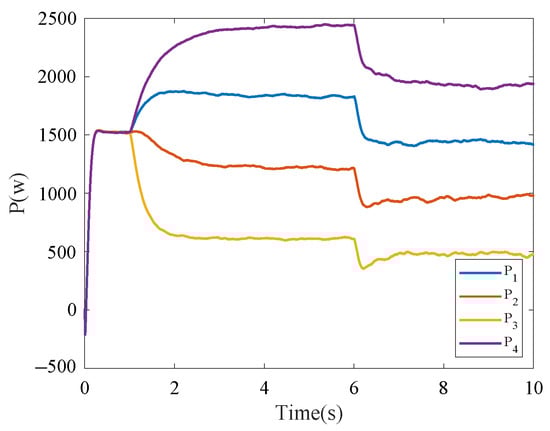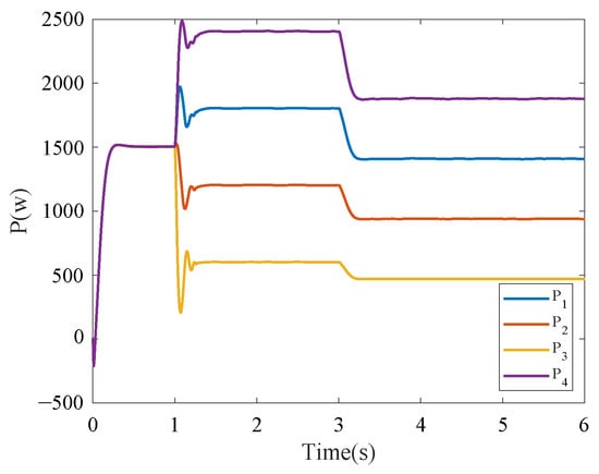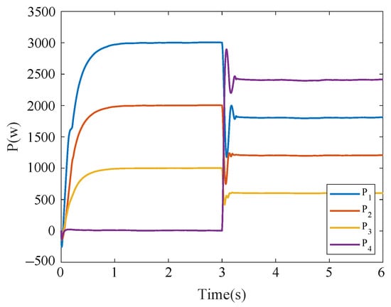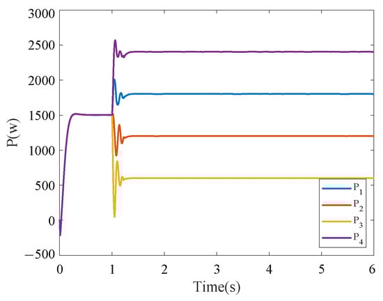 The experiments were tested in the StarSim HIL simulator. The equipment is manufactured and designed by National Instruments. Meanwhile, a new case was designed to better demonstrate the performance of the event-triggered fixed-time power-sharing-based control strategy and to demonstrate the power bi-directional flow function of the BIC. The DC loads are set as 7 KW, AC load as 2 KW, and other parameters are the same as in Case 1. At s, the system utilizes the proposed fixed-time event-triggered control strategy, and the transmission power of each BIC of this system is shown in Figure 16. The transmitted power is negative, indicating that the power is transmitted from the AC measurement to the DC side, and the four BICs transmit the power according to the ratio of 3:2:1. It is demonstrated that the power can flow bi-directionally in the BICs.