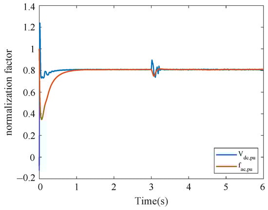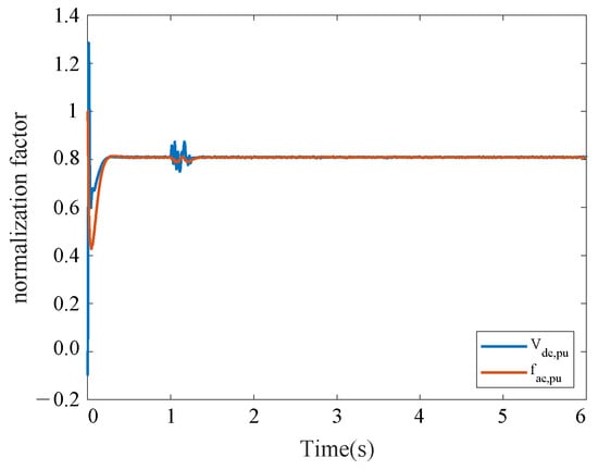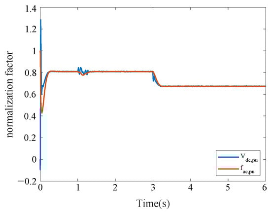 According to the droop formula of the subgrid in Section 2.1, the AC bus frequency and DC bus voltage represent the sum active power of the main voltage sources of the AC and DC subgrid, respectively. To combine AC droop characteristics and DC droop characteristics in the same dimension, the AC bus frequency f and DC bus voltage can be normalized as []: