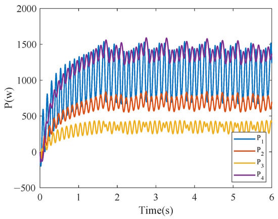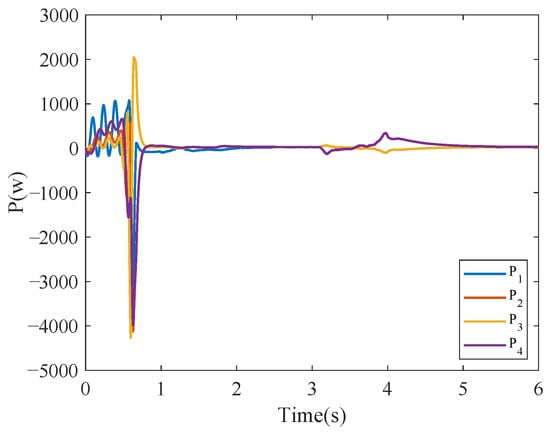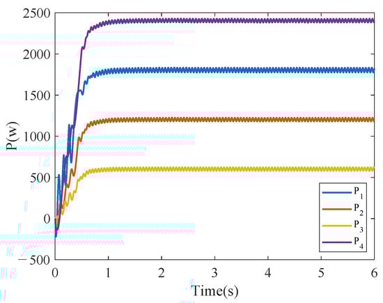 Notably, the effect of time delay on the stability of the system is obtained from the previous analysis, and the communication delay between BICs is unavoidable in a multi-BIC system. The parameter , which represents the communication delay, needs to be studied as a key parameter affecting the stability of the system. By varying the magnitude of , the maximum magnitude of communication delay is obtained so that the system can converge under this communication network, which can be of great significance for further optimization of the control strategy. The communication delay containing different time durations in the control is simulated and verified in simulink, and the following results are obtained. Case 4 is set to start four BICs at the same time at s. Setting the communication delay in the control loops of all four BICs, the power waveforms transmitted by the BICs as illustrated in Figure 10, Figure 11 and Figure 12 when is 5 ms, 10 ms, and 20 ms. As increases, the system tends to become unstable. In order to make sure that the HMG under study operates in a stable state, the communication delay of the system cannot be too large.